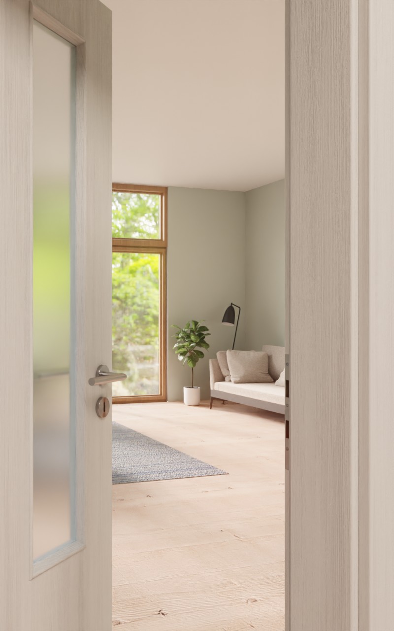 Ich spokojny rysunek drewna, z delikatnymi, pionowymi liniami słojów i odcieniami na jasnoszarym tle, harmonizuje z każdą koncepcją wnętrza. Krótki, wąski otwór świetlny ciągnie się od strony zamka przez skrzydło drzwi.
