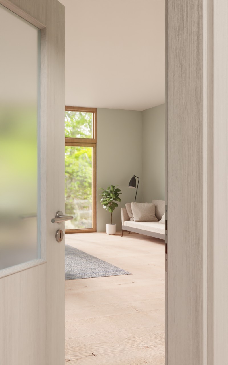 Na jasnoszarym dekorze Authentic Grigio widoczne są delikatne, pionowe linie słojów oraz subtelne odcienie, które nadają drewnianemu wyglądowi spokojną aurę. Centralnym elementem stylu jest prostokątny otwór szklany w górnej części skrzydła drzwiowego.