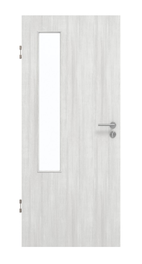 Krótki, wąski przeszklenie rozciąga się wzdłuż boku zawiasów na skrzydle drzwi. Dekor Authentic Grigio dzięki dyskretnej strukturze drewna z delikatnymi liniami słojów i odcieniami doskonale wpasowuje się w każdy pokój. Dzięki swojej odporności, łatwy w pielęgnacji dekor HPL jest odporny na ścieranie i zarysowania.