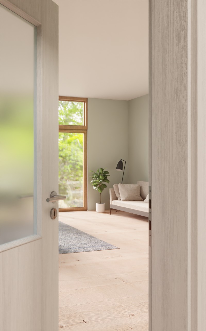 Prostokątny przeszklenie jest szczególnie cennym elementem w ciemnych pomieszczeniach, ponieważ umożliwia przyjemny dopływ światła. Dzięki spokojnemu rysunkowi drewna z delikatnymi liniami i odcieniami, które wyróżniają się na jasnoszarym tle, dekor Authentic Grigio doskonale wpasowuje się w każde koncepcje aranżacyjne. Powłoka HPL jest również łatwa w pielęgnacji oraz przyjemnie odporna na ścieranie i zarysowania.