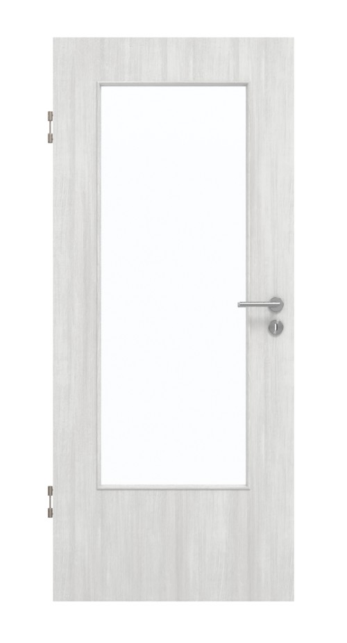 Duży, prostokątny przeszklenie wypełnia większość skrzydła drzwiowego. Dzięki spokojnemu rysunkowi drewna, który pokazuje delikatne, pionowe linie słojów i odcienie na jasnoszarym tle, dekor Authentic Grigio harmonizuje z każdym konceptem aranżacyjnym. Powłoka HPL jest również łatwa w pielęgnacji oraz przyjemnie odporna na ścieranie i zarysowania.