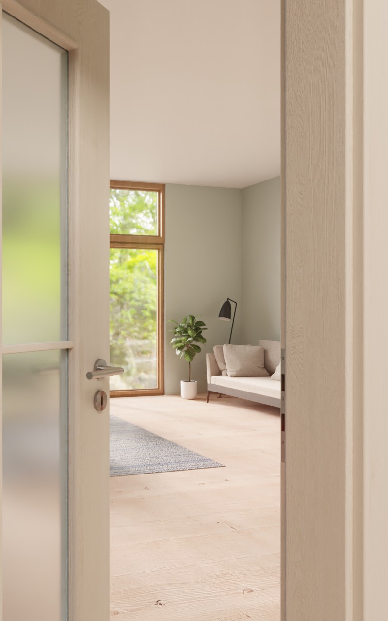 Jasny odcień i delikatne słoje są charakterystyczne dla wzoru Authentic Pearl. Rama z prostymi szprosami dzieli przeszklenie na cztery równe części.