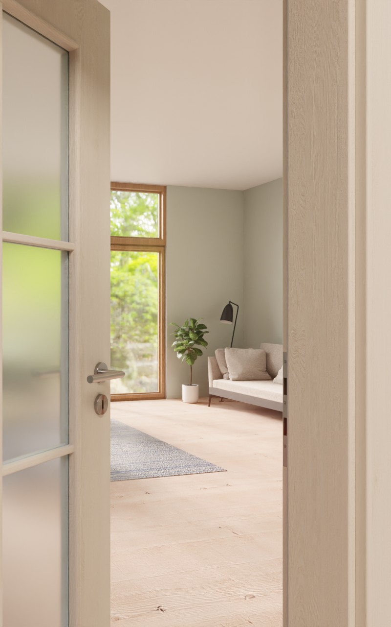 Jasne odcienie i delikatne słoje nadają dekorowi Authentic Pearl jego naturalny charakter. Dzięki dużemu przeszkleniu do pomieszczenia wpada dużo światła, co dodatkowo je rozjaśnia. Delikatne pręty dzielą szybę na sześć równych części.