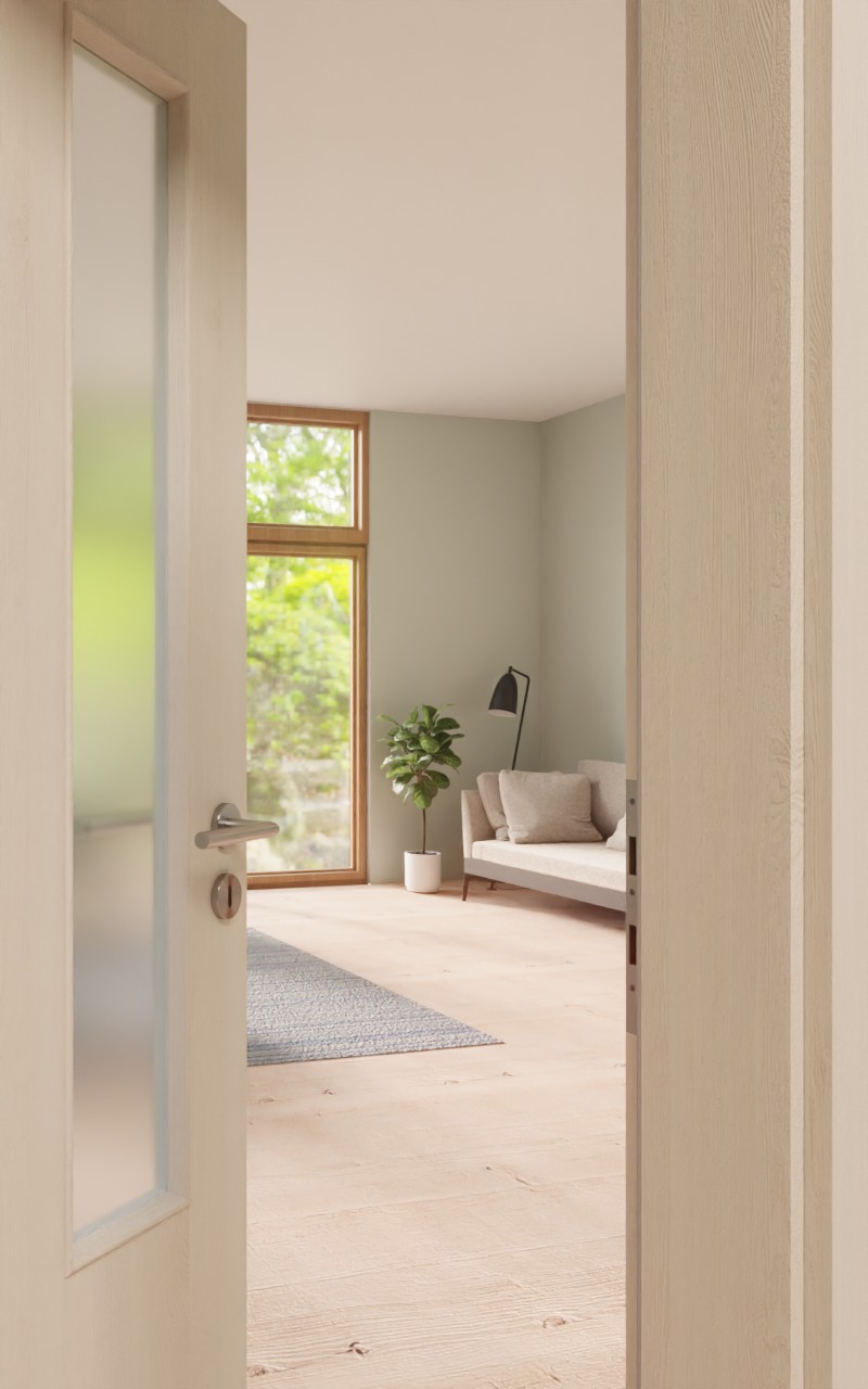 Zapraszające drzwi wewnętrzne w dekorze HPL Authentic Perl z atrakcyjnym przeszkleniem: