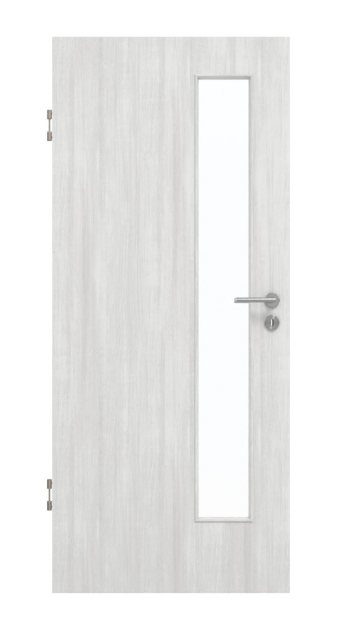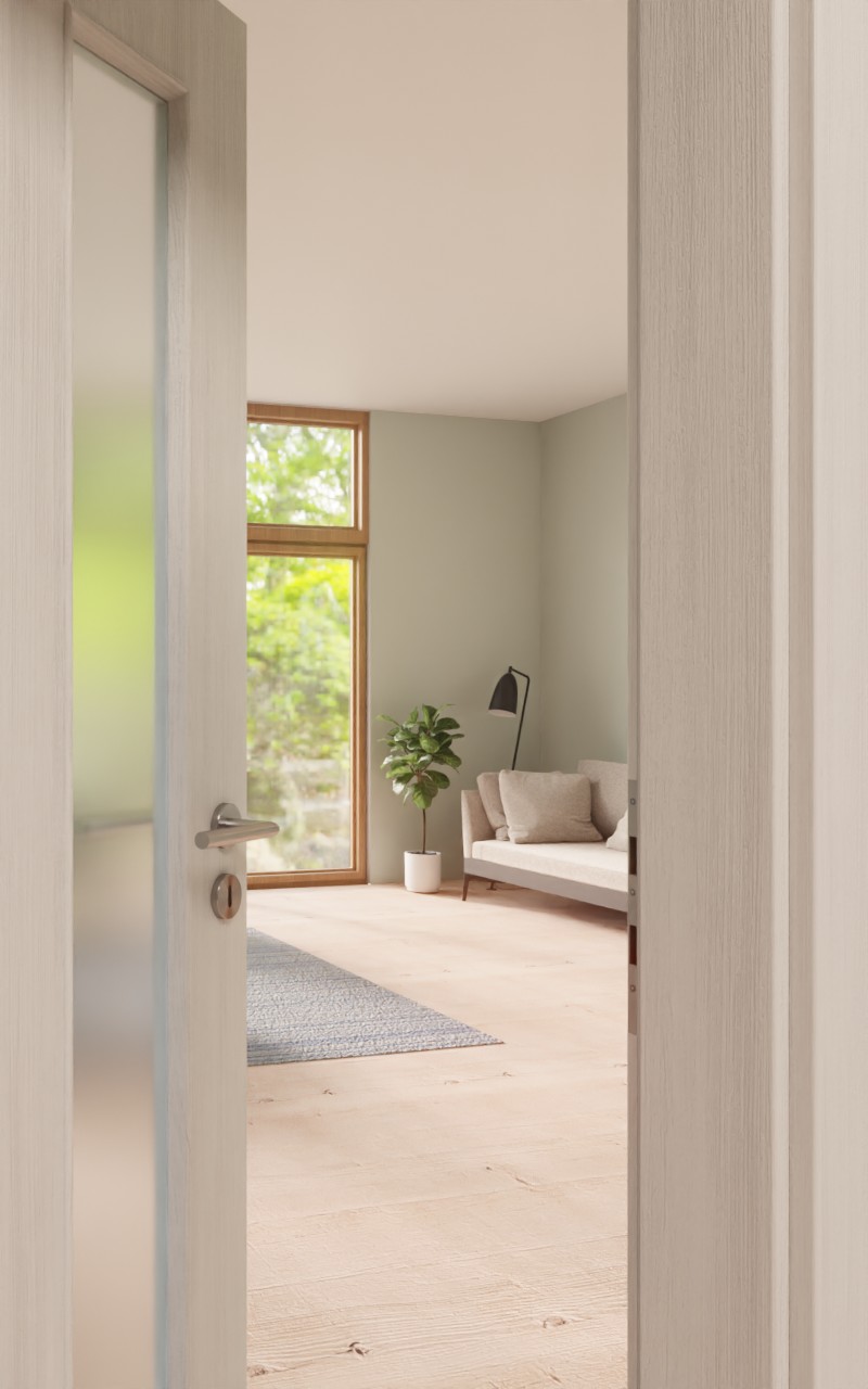 Wykończenie Authentic Grigio dzięki subtelnej strukturze drewna z delikatnymi liniami rocznymi i odcieniami wkomponowuje się w każde wnętrze. Wąski przeszklenie dekoracyjnie eksponuje drzwi, a także pozwala na piękny dopływ światła do pomieszczenia.