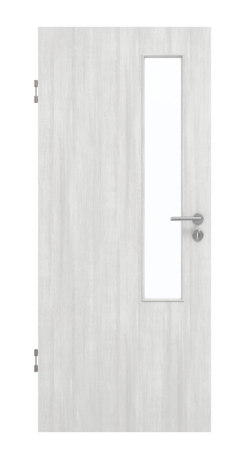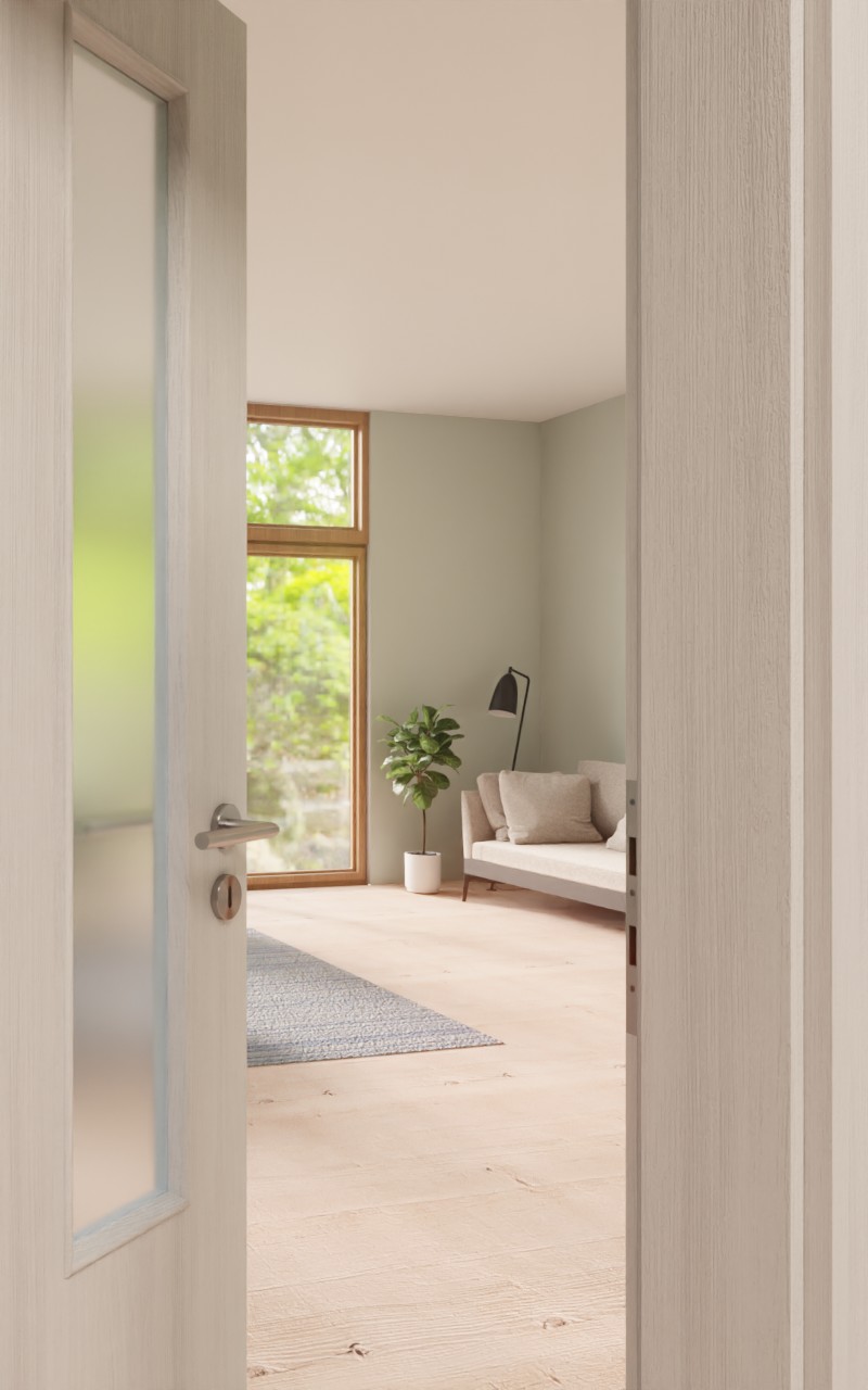 Na dekoracyjnym krótkim, wąskim przeszkleniu od strony zamka rozciąga się górna część drzwi. Dzięki spokojnemu rysunkowi drewna, który ukazuje delikatne, pionowe linie słojów i cieniowania na jasnoszarym tle, dekor Authentic Grigio harmonizuje z każdym konceptem wnętrza. Dodatkowo, laminat HPL okazuje się bardzo odporny, odporny na światło i łatwy w pielęgnacji.