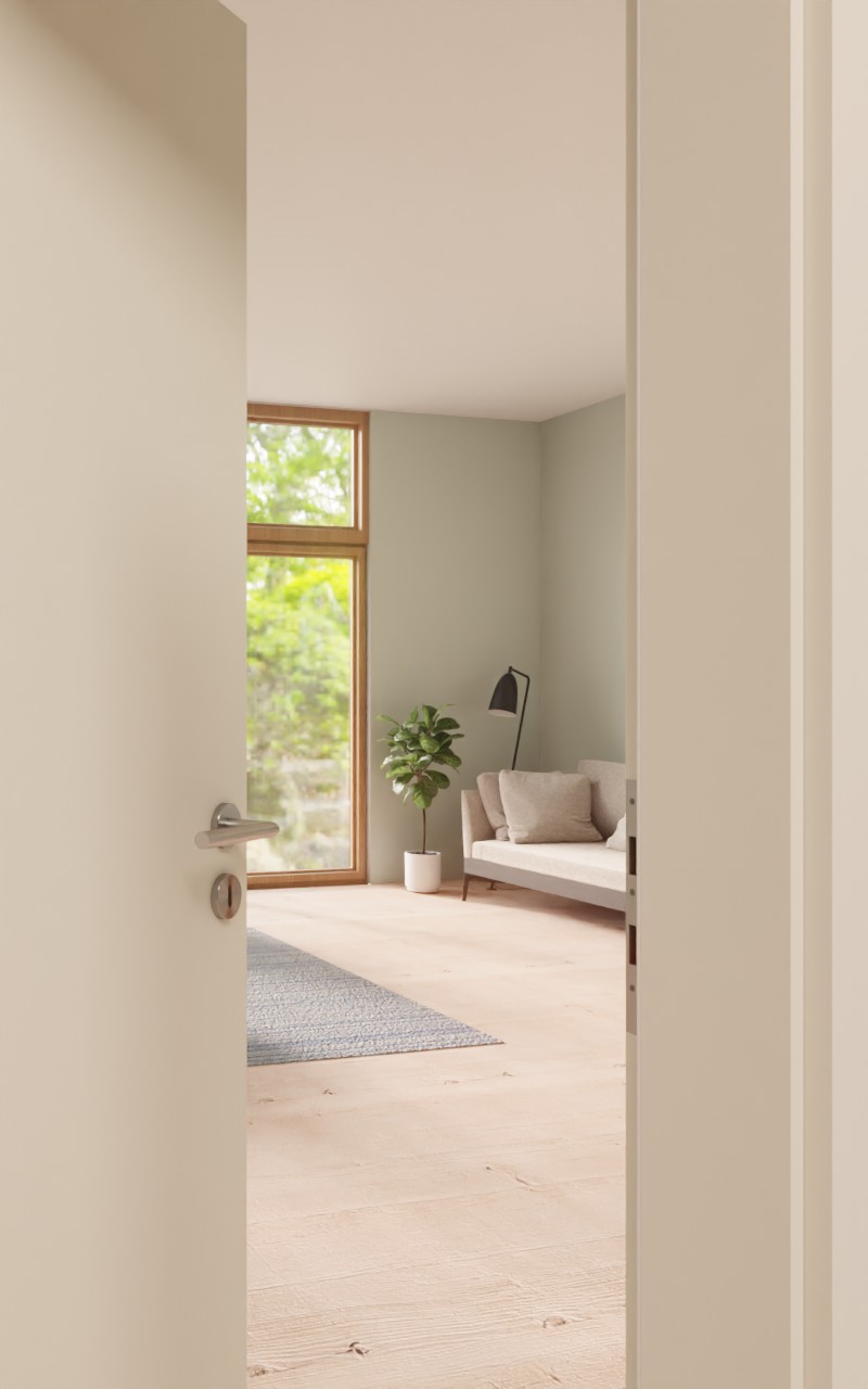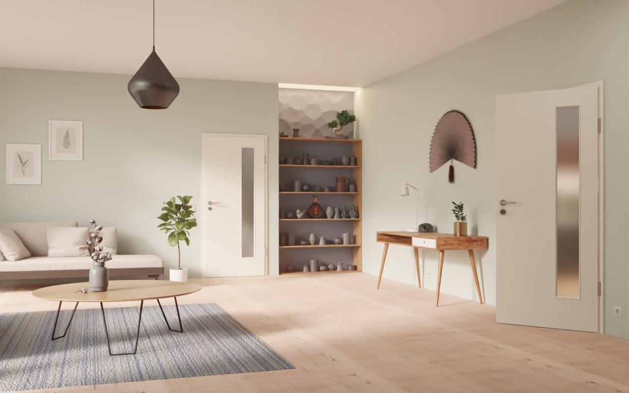 Drzwi wewnętrzne odporne na zarysowania w dekorze HPL białym lakierze 9010 z eleganckim przeszkleniem: