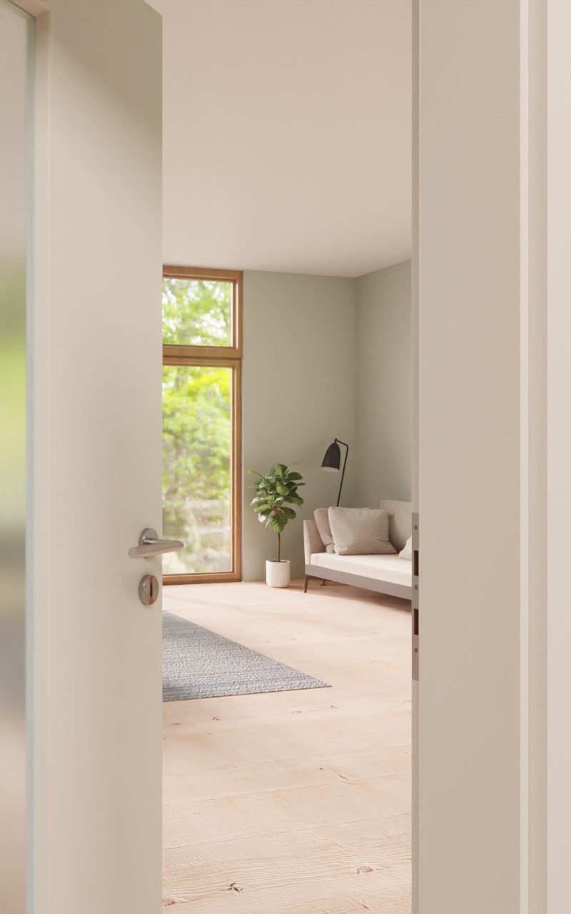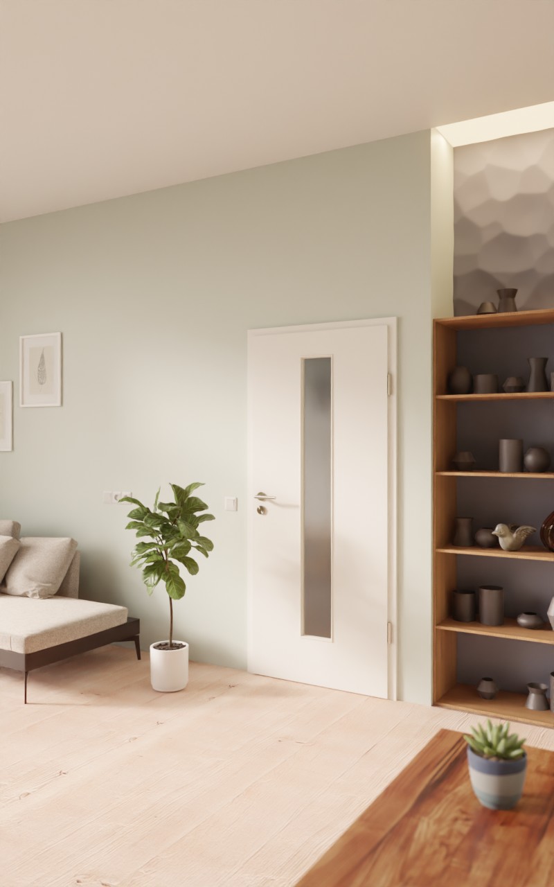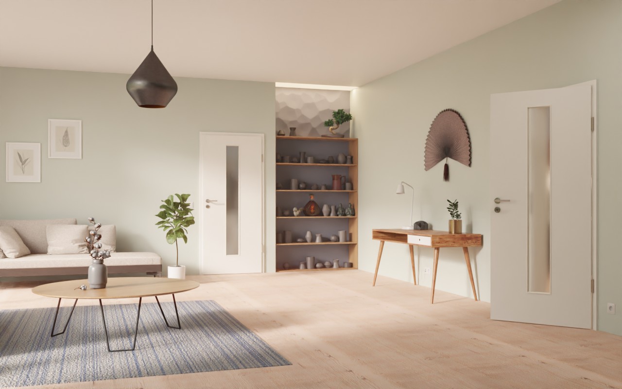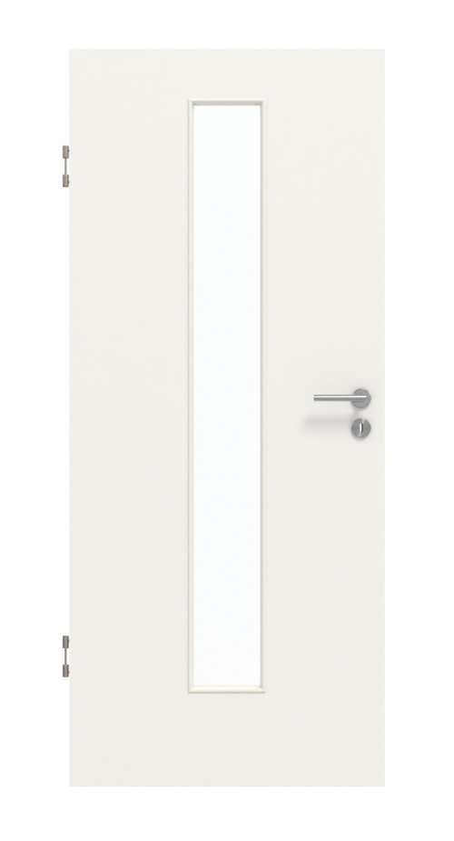 Wytrzymałe drzwi wewnętrzne w dekorze HPL Białe lakier 9016 z stylowym przeszkleniem: