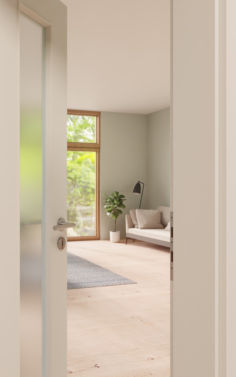 Wytrzymałe drzwi wewnętrzne w dekorze HPL białego lakieru 9016 z atrakcyjnym przeszkleniem: