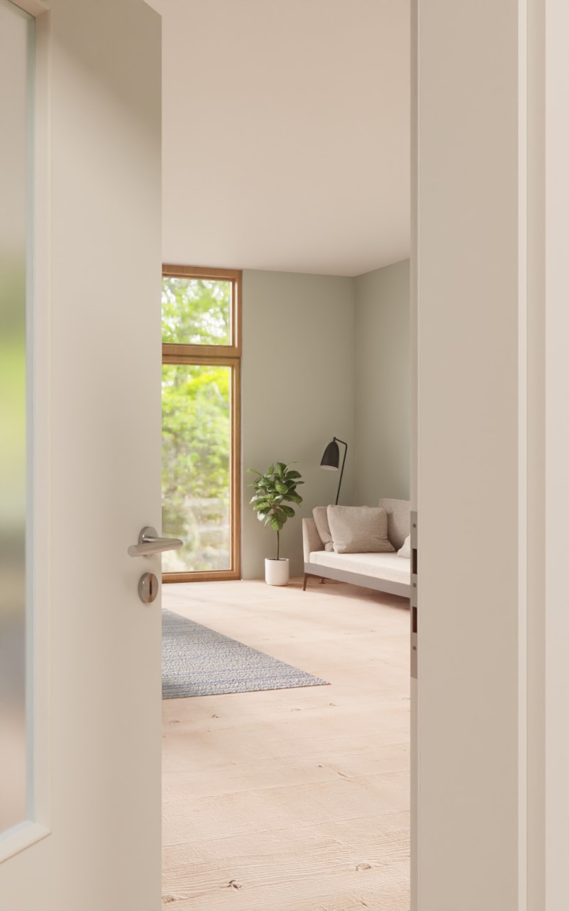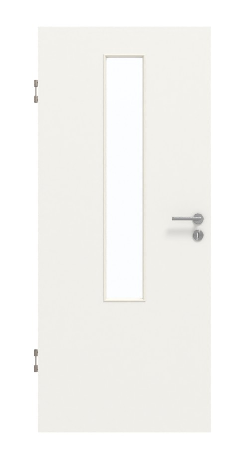 Zapraszające drzwi pokojowe w dekorze HPL białym lakierze 9016 z eleganckim przeszkleniem: