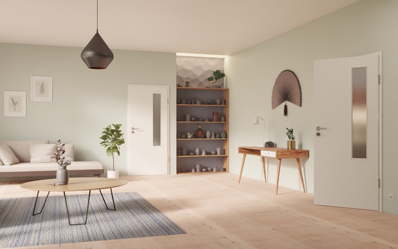 Drzwi wewnętrzne najwyższej jakości w dekorze HPL białym lakierze 9016 z eleganckim przeszkleniem: