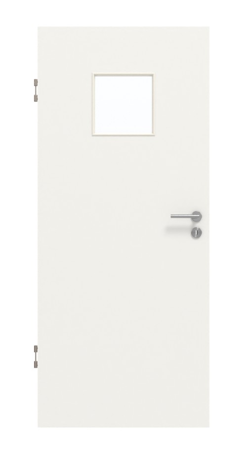 Stylowa drzwi wewnętrzne w dekorze HPL białego lakieru 9016 z eleganckim przeszkleniem: