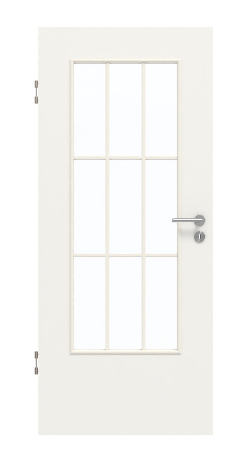 Elegancka ramka z poprzeczkami dzieli duży otwór okienny na dziewięć równych pól. Białe skrzydło drzwiowe idealnie pasuje zarówno do klasycznych, jak i nowoczesnych wnętrz. Warstwa dekoracyjna HPL charakteryzuje się wysoką odpornością na ścieranie oraz łatwością w pielęgnacji.