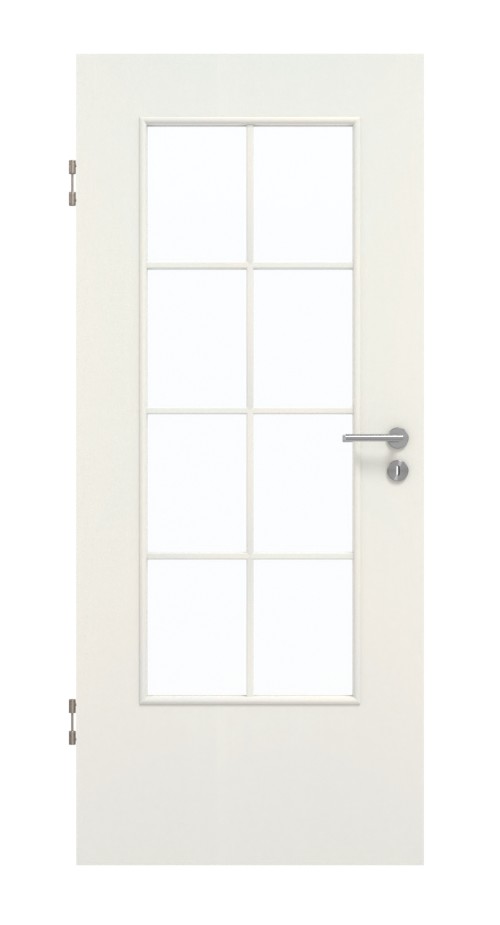 Na białym skrzydle drzwiowym wyczuwalna jest struktura. Dzięki dużemu wycięciu na szybę drzwi przepuszczają światło z sąsiedniego pomieszczenia, sprawiając, że nawet ciemne pokoje stają się jasne.