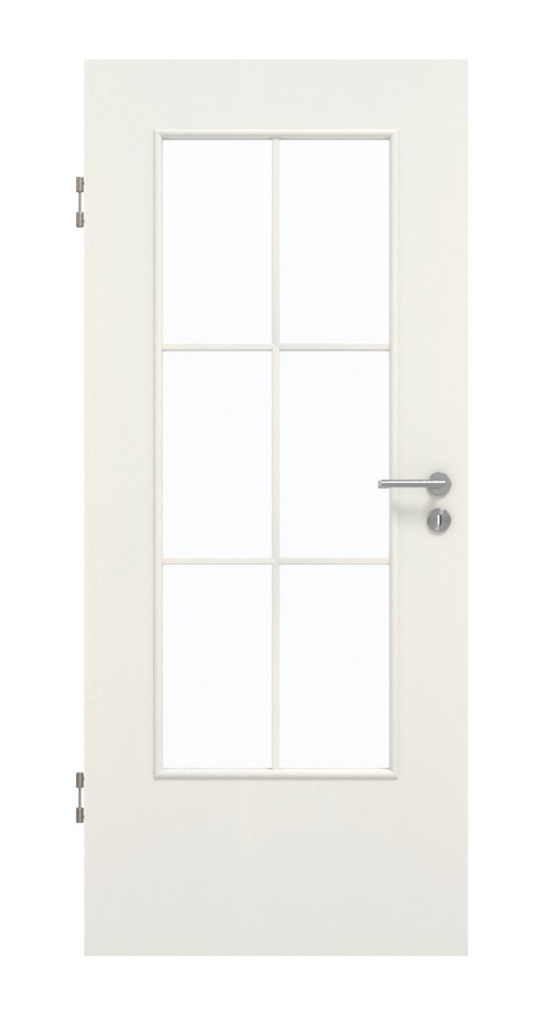 Białe skrzydło drzwiowe przekonuje wytłoczoną strukturą nie tylko pod względem wizualnym, ale także dotyku. Drzwi zawdzięczają swój harmonijny wygląd dużemu przeszkleniu, które jest elegancko podzielone szprosami.