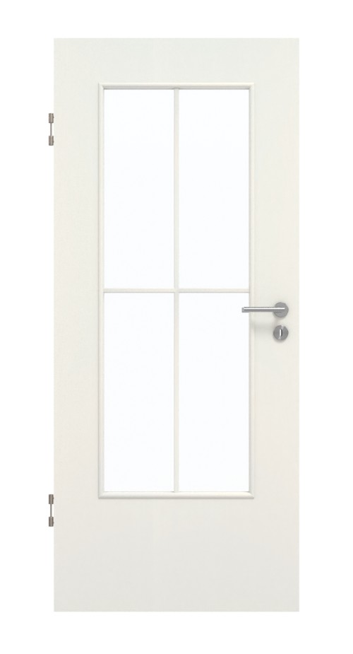 Białe skrzydło drzwiowe ma wyczuwalną strukturę. Duże wycięcie na szybę, podzielone eleganckimi szprosami na cztery równe pola, zapewnia doskonały dostęp światła do pomieszczeń.
