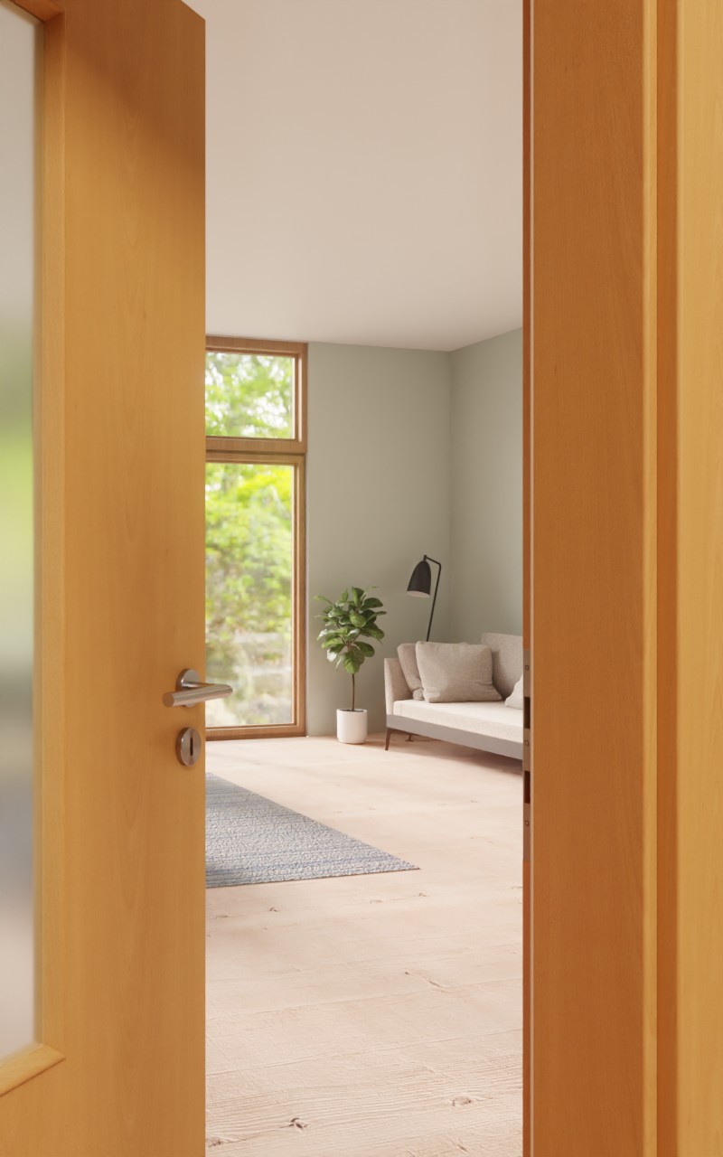 Wykończenie bukowe Exklusiv zachwyca wzorem drewna i ciepłym odcieniem – dwa cechy, które nadają powierzchni szczególną atrakcyjność. Krótki, smukły przeszklenie zdobi środek skrzydła drzwiowego.