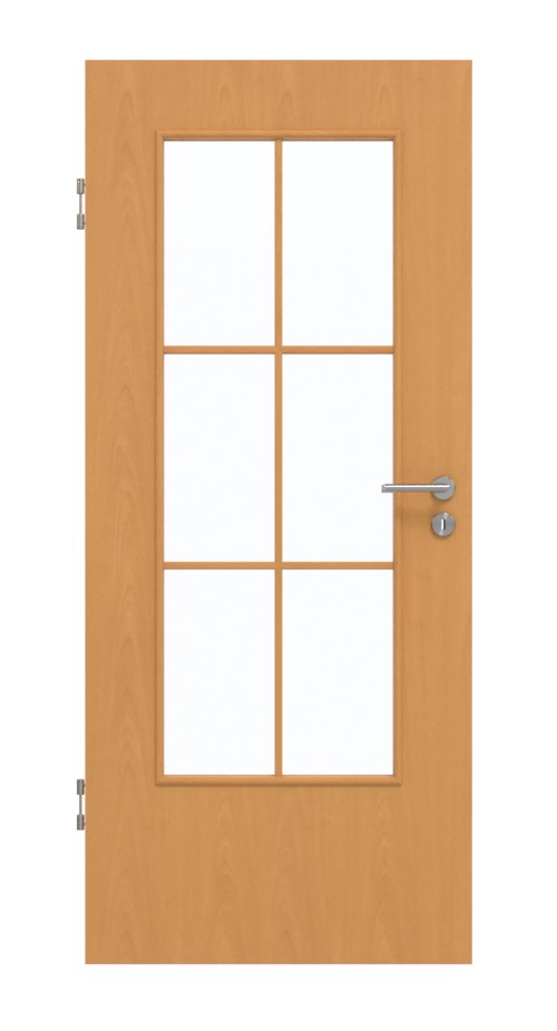 Przytulny charakter dekoru drewnianego buk ekskluzywny podkreślony jest brązowym odcieniem, na którym rysuje się delikatny wzór z linii rocznych słojów. Subtelne listwy dzielą prostokątny otwór szklany na sześć równych pól.