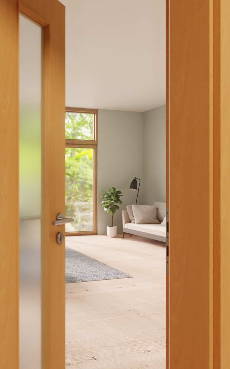 Dzięki umieszczonemu po stronie zamka wycięciu na szybę światło dzienne może wpadać również do pozbawionego okien korytarza. Brązowy odcień podkreśla przytulny charakter dekoru buku Exklusiv, na którym widoczny jest filigranowy wzornik słojów rocznych. Ponadto ten nadający się do codziennego użytku laminat HPL charakteryzuje się wysoką odpornością na ścieranie .