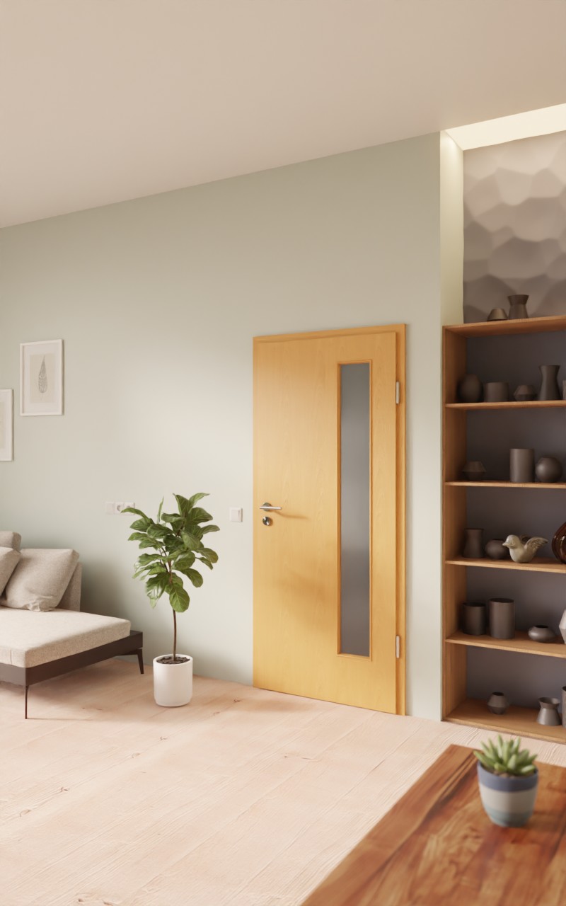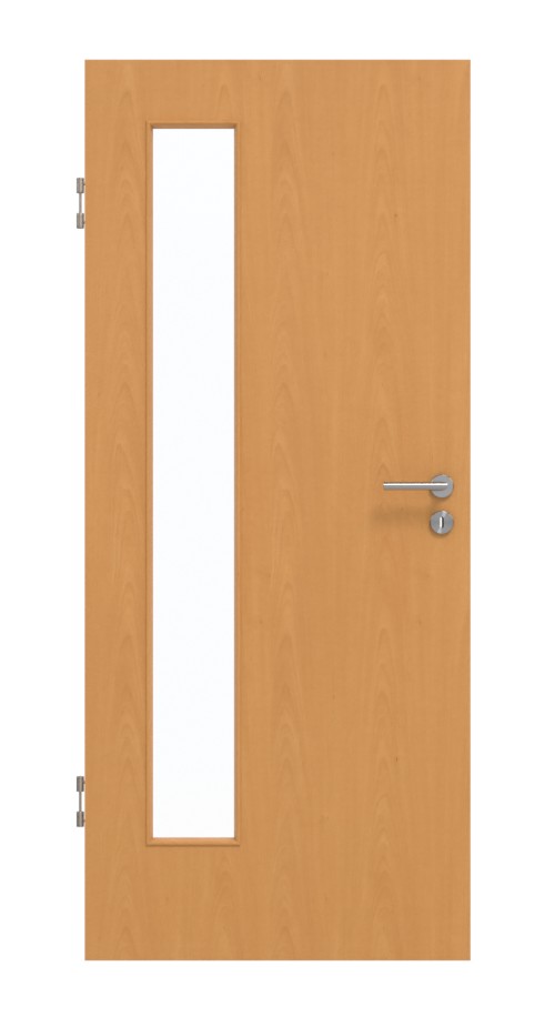 Wąski, prostokątny wycięcie w szybie zapewnia piękny dopływ światła. Brązowy odcień podkreśla przytulny charakter dekoracji drewnianej Buk Ekskluzywny, na której widoczny jest delikatny wzór słojów. Ponadto płyta laminowana HPL okazuje się bardzo wytrzymała, odporna na działanie światła i łatwa w pielęgnacji.