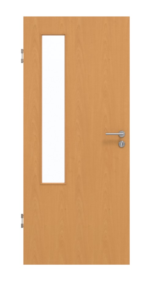 W górnej części skrzydła drzwiowego znajduje się wąskie przeszklenie postronie zawiasów. Delikatny wzór słojów podkreśla przytulny charakter dekoracji drewnianej Buk Ekskluzywny, utrzymanej w brązowej tonacji. Powierzchnia HPL wyróżnia się ponadto wysoką odpornością na ścieranie oraz łatwością w pielęgnacji.