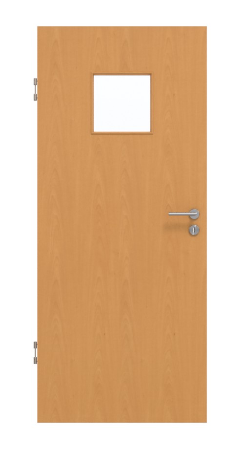 W górnej części skrzydła drzwiowego znajduje się kwadratowe przeszklenie. Wzór słojów drewna i ciepły odcień nadają dekorowi Buk Ekskluzywny niepowtarzalny urok. Dzięki swojej wytrzymałości łatwy w pielęgnacji dekor HPL jest odporny na ścieranie i zarysowania.