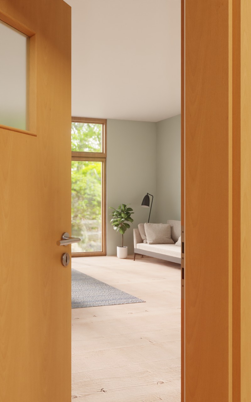 Skrzydło drzwiowe jest wzmocnione warstwą środkową z płyty wiórowej oraz ramą z płyty MDF. Produkt został przetestowany w grupie obciążenia M i może być stosowany zarówno w pomieszczeniach prywatnych, jak i biurowych.