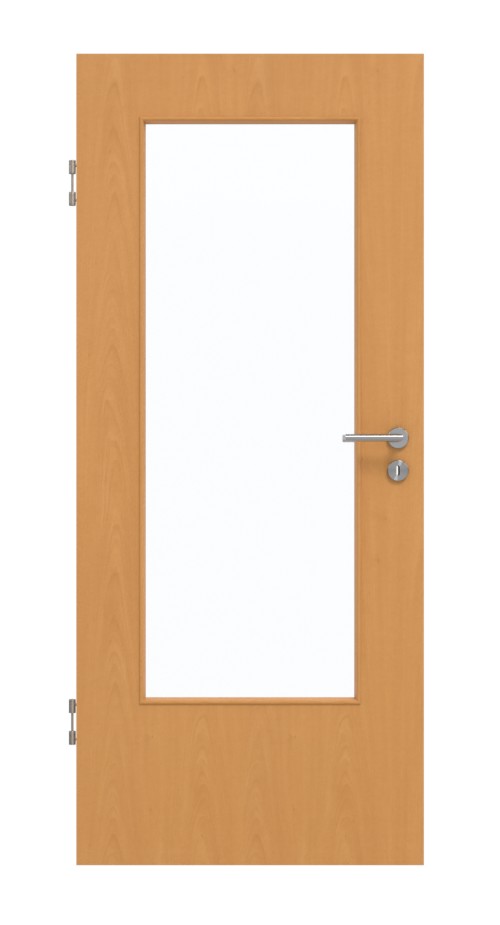 Duże, prostokątne przeszklenie wypełnia większość skrzydła drzwiowego. Dekor drewniany Buk Ekskluzywny, charakteryzujący się delikatnym wzorem słojów, ma brązowy odcień, który podkreśla jego przytulny charakter. Odporność na zarysowania i uderzenia to dodatkowa zaleta łatwej w pielęgnacji powłoki HPL.
