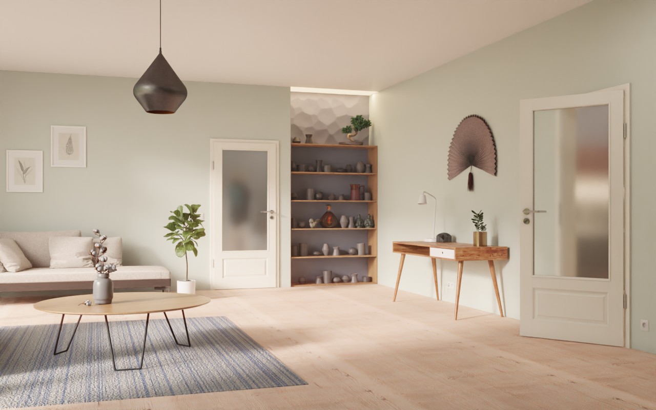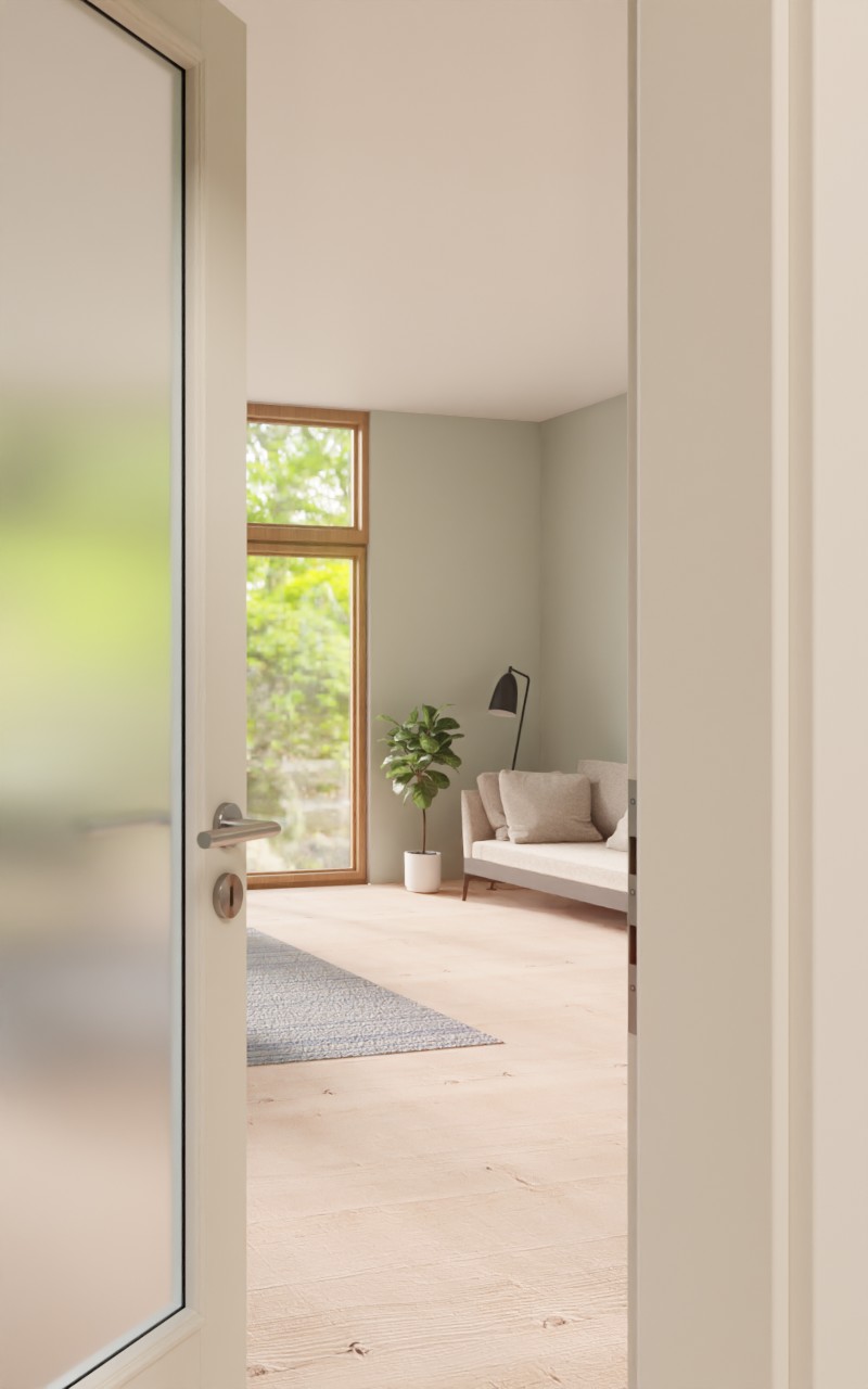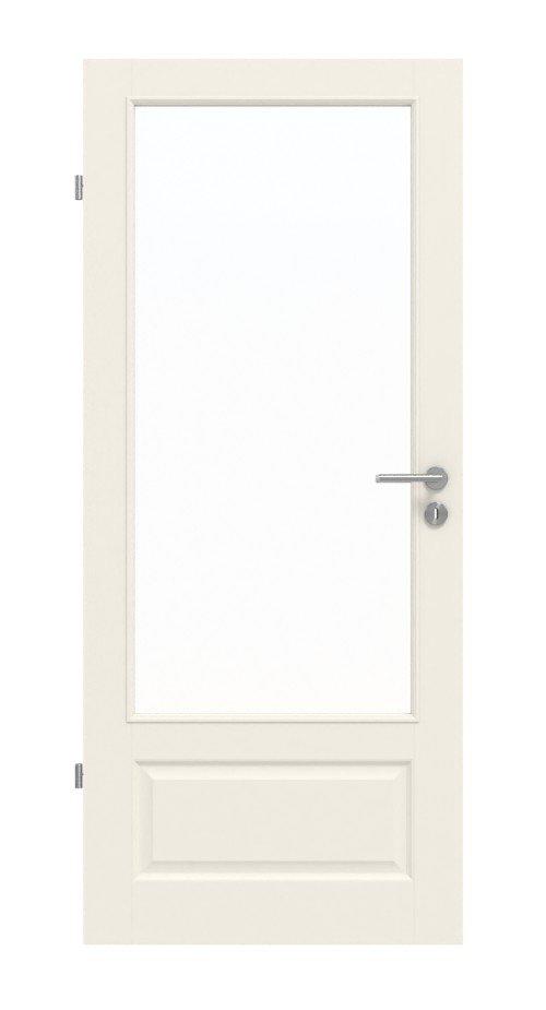 Dzięki dużemu przeszkleniu do okna w przedpokoju wpada światło dzienne. Otwór świetlny jest uzupełniony mniejszą, wytłaczaną wypełnieniem w dolnej części drzwi. Klasyczny design podkreśla matowy biały lakier, dostępny w wariantach RAL 9010 i RAL 9016. Lakier jest nakładany w ekologiczny sposób wielokrotnie i jednorodnie, a następnie utwardzany UV. Dzięki temu uzyskuje się łatwą w pielęgnacji oraz odporną na zarysowania i brud powierzchnię o przyjemnej fakturze.