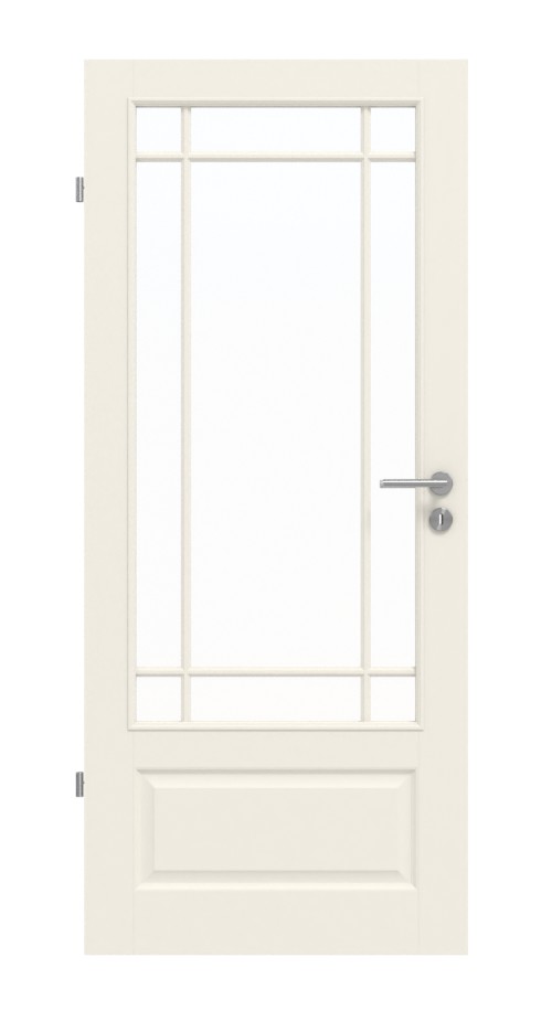 W centrum pięknego designu znajduje się duże przeszklenie, ozdobione delikatną ramą z przeszkleń. Poniżej wypełnienie z wytłoczeniem zdobi skrzydło drzwi. Matowy biały lakier podkreśla klasyczny wygląd. Dzięki wielokrotnemu nałożeniu lakieru akrylowego i utwardzeniu UV powstaje jednorodna powierzchnia o nowoczesnym komforcie pielęgnacji i wysokiej odporności.