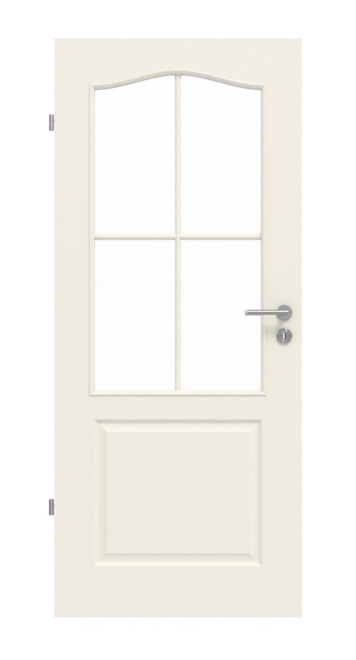 Duży, delikatnie zaokrąglony szkło ozdobiony jest subtelną ramą z przeszkleń. Pod otworem świetlnym znajduje się wyprofilowana prostokątna wypełnienie. Klasyczny wygląd podkreśla matowy biały lakier. Ekologiczna wielowarstwowa powłoka jest utwardzana UV, co czyni ją odporną na ścieranie i łatwą w pielęgnacji.