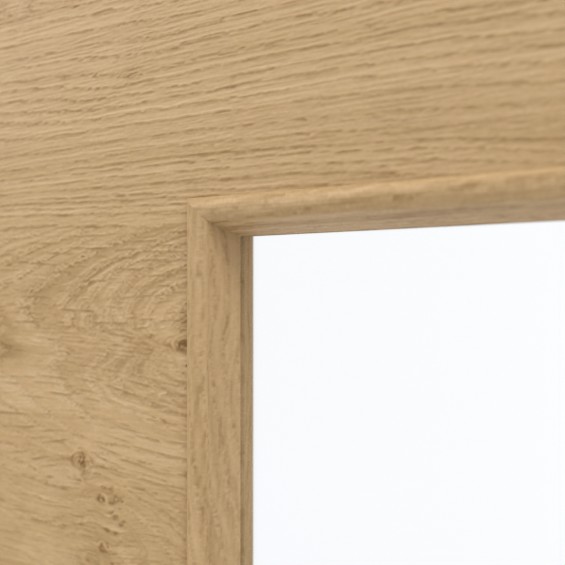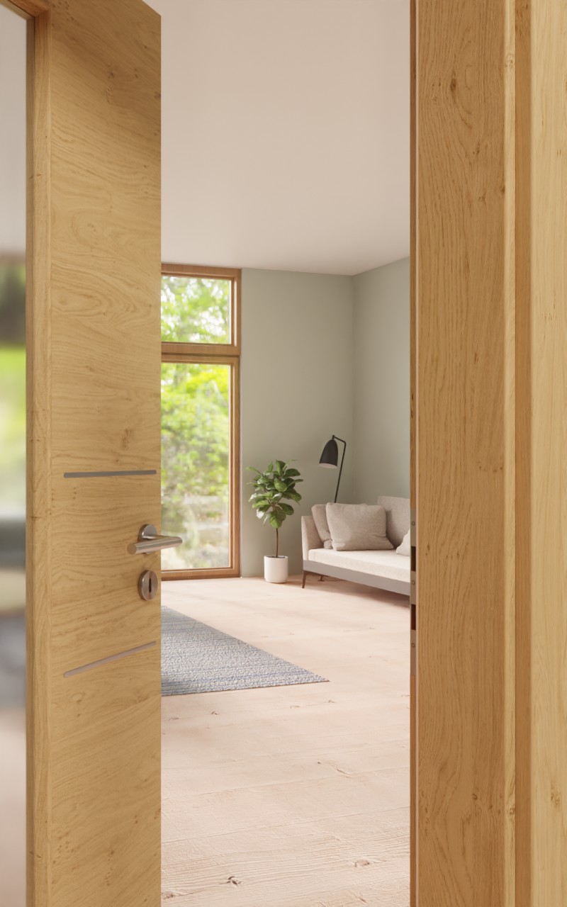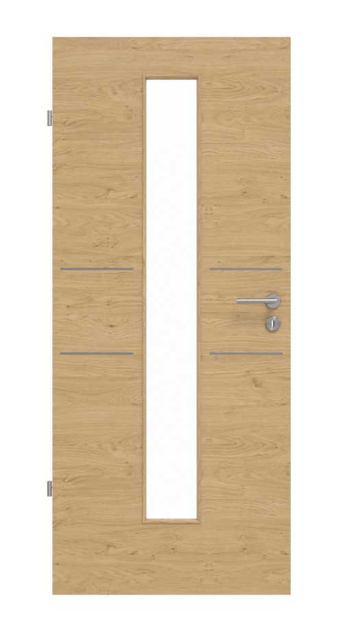 Długi, wąski pas światła przebiega pionowo przez środek skrzydła drzwiowego. Na wysokości klamki jest on podkreślony po obu stronach dwoma krótkimi lizenami. Przyjemny dla oka wygląd drewna w dekorze Authentic Asteiche zyskuje nowoczesny charakter dzięki poziomemu układowi desek. Odporna na uderzenia i zarysowania warstwa wierzchnia z CPL jest bardzo łatwa w czyszczeniu.