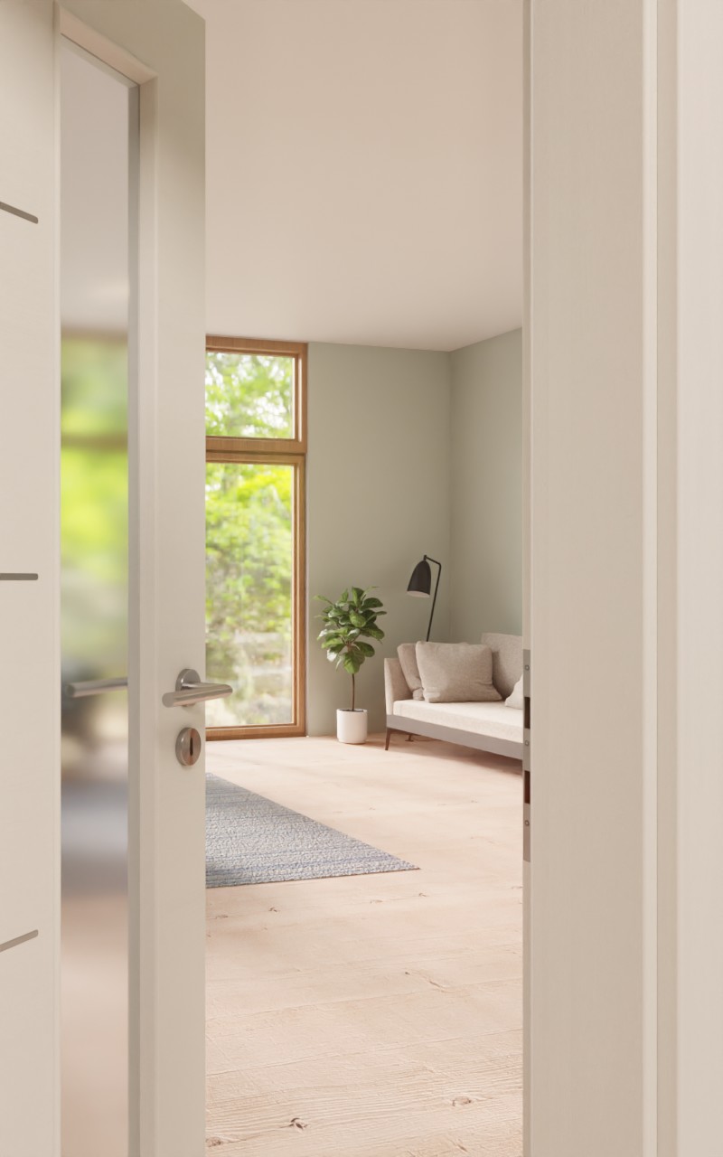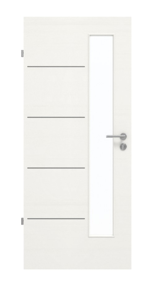 Obok klamki znajduje się wąskie wycięcie na szybę. Jest stylowo otoczone czterema delikatnymi lizenami po stronie zawiasów. Naturalne, poprzeczne usłojenie i biały odcień idealnie do siebie pasują. Odporna na uderzenia i zarysowania warstwa wierzchnia z CPL jest bardzo łatwa w czyszczeniu.