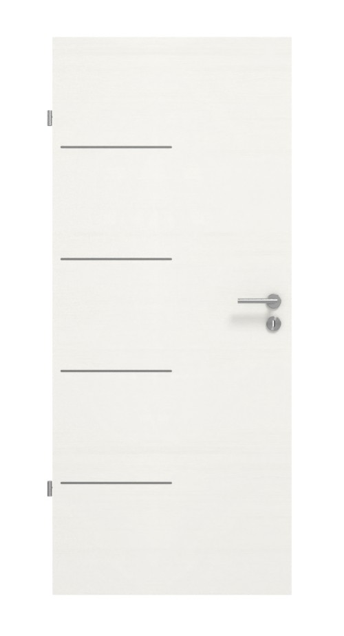 Nowoczesny akcent nadają cztery krótkie listwy, które biegną od strony zawiasów do środka skrzydła drzwi. Poprzeczne usłojenie drewna doskonale komponuje się z białą barwą. Trwała i łatwa w pielęgnacji powierzchnia CPL jest odporna na zarysowania i uderzenia.