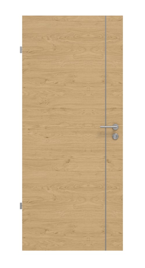Wysokość drzwi designerskich jest stylowo podkreślona przez pionową listwę po stronie zamka. Na pięknym dekorze Authentic dąb szypułkowy rozciągają się wzdłużne słoje drewna i drobne cieniowania. Łatwa w pielęgnacji warstwa wierzchnia z CPL przekonuje swoją odpornością na zarysowania.