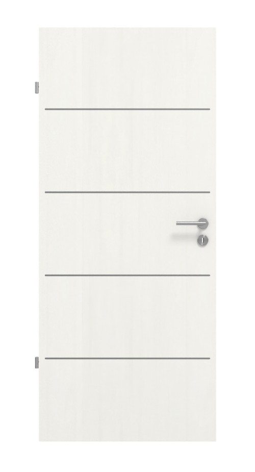 W poprzek skrzydła drzwi biegną cztery równomiernie rozmieszczone lizeny. W nowoczesnym i świeżym odcieniu białym widoczne są drobne usłojenia, podobnie jak w przypadku prawdziwego drewna. Odporna na zarysowania i uderzenia warstwa wierzchnia z CPL jest bardzo łatwa w pielęgnacji.