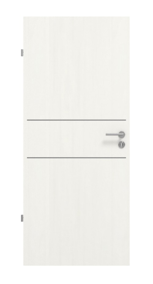 Nad i pod klamką biegną dwie eleganckie listwy w poprzek skrzydła drzwi. Dzięki jasnej, przejrzystej stylistyce dekor Authentic Bianco zapewnia harmonijną atmosferę przytulności. Warstwa wierzchnia CPL nie tylko pięknie się prezentuje, ale także przekonuje swoimi właściwościami odporności na uderzenia i zarysowania.
