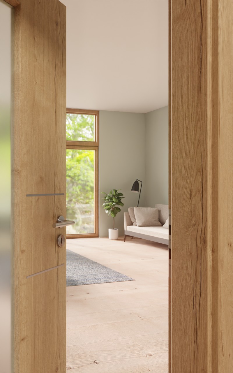 W środkowej części skrzydła drzwiowego znajduje się długi wycięty fragment szkła, który po lewej i prawej stronie jest podkreślony dwoma krótkimi lizenami. Charakterystyczne usłojenie dekoru z drewna Authentic dąb szczelinowy tworzy przytulną i komfortową atmosferę. Dzięki łatwej w pielęgnacji powłoce CPL powierzchnia skrzydła drzwiowego długo zachowuje swój piękny wygląd.