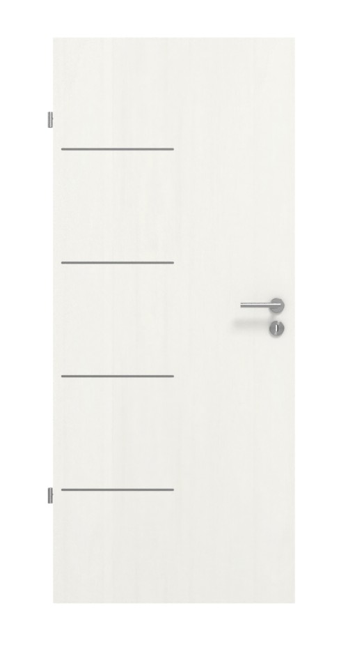 Po stronie ościeżnicy cztery eleganckie listwy zdobią skrzydło drzwi. Dzięki białej barwie i podłużnym słojom drewna wygląda świeżo i nowocześnie. Oprócz atrakcyjnego wyglądu łatwa w pielęgnacji warstwa wierzchnia z CPL przekonuje również swoją odpornością na uderzenia i zarysowania.
