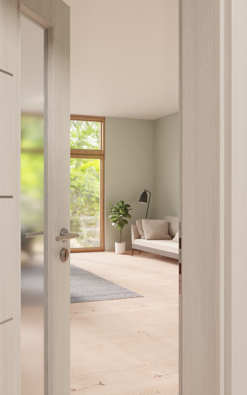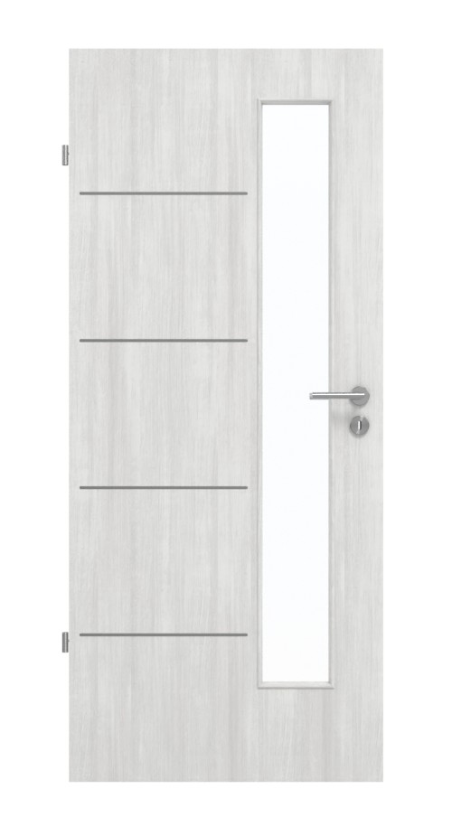 Dzięki wąskiemu przeszkleniu po stronie klamki drzwi sprawiają wrażenie otwartych i przyjaznych. Po stronie taśmy cztery lizeny dopełniają wyrafinowany design. Wzdłuż długości skrzydła drzwiowego rozciąga się szary odcień z drobnymi cieniami. Odporna na zarysowania i uderzenia warstwa wierzchnia z CPL jest łatwa w pielęgnacji.