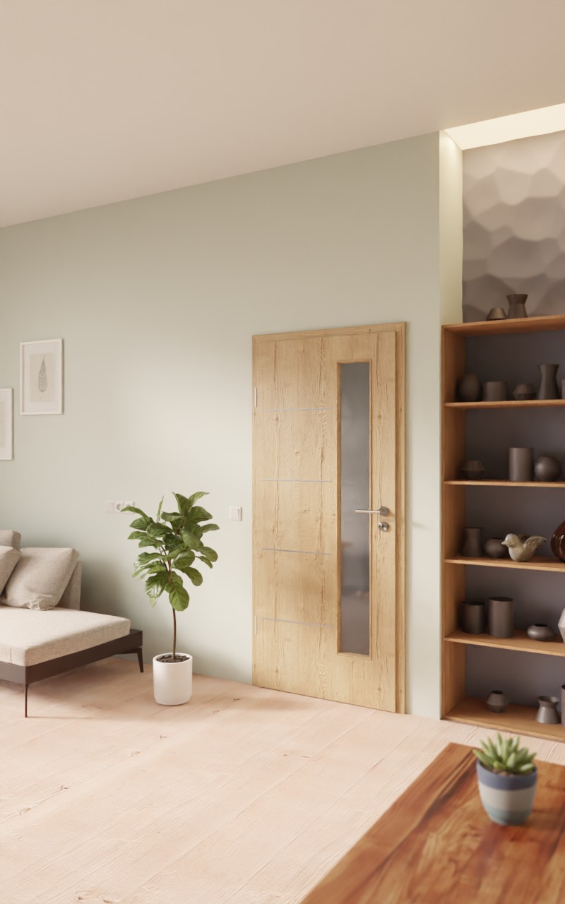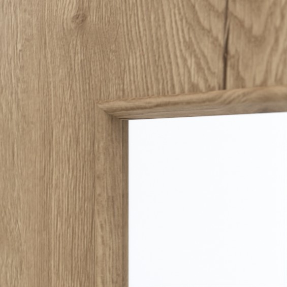 Dzięki długości i wąskiemu kształtowi przeszklenie na stronie zamka nadaje mu nowoczesny wygląd. Strona opaski jest ozdobiona czterema drobnymi lizenami. Skrzydło drzwiowe charakteryzuje się autentycznym, ciemnym usłojeniem drewna, które ożywia design Authentic dąb szczelinowy. Odporna na uderzenia i zarysowania warstwa wierzchnia z CPL jest bardzo łatwa w czyszczeniu.