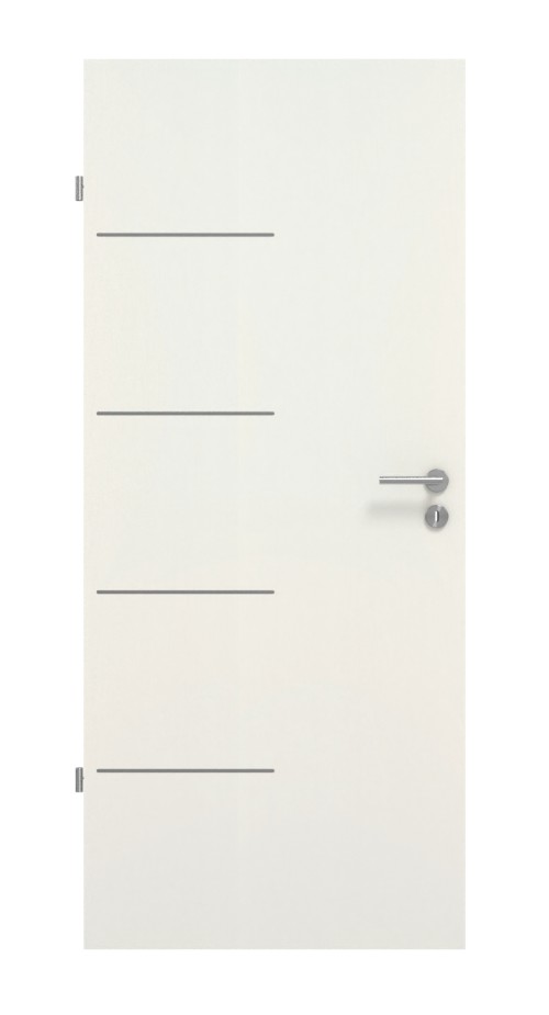Od strony ościeżnicy skrzydło drzwi zdobią cztery krótkie lizeny . Dekor biel Struktura Premium charakteryzuje się jednolitą powierzchnią w kolorze białym, którą można wyczuć dzięki subtelnej strukturze. Łatwa w pielęgnacji powłoka CPL zapewnia odporność na zarysowania, na której można polegać w trudnych warunkach codziennego użytkowania.