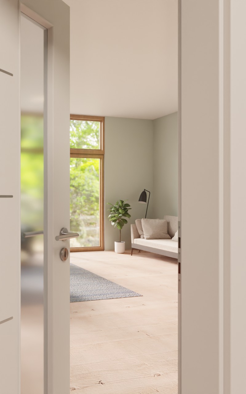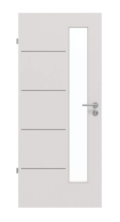 Obok klamki znajduje się wąskie wycięcie na szybę. Jest stylowo otoczone czterema delikatnymi lizenami po stronie zawiasów. Nowoczesne skrzydło drzwiowe z powierzchnią CePaL Silver Grey przekonuje harmonijnym odcieniem szarości. Trwała i łatwa w pielęgnacji powierzchnia CPL jest odporna na zarysowania i uderzenia.