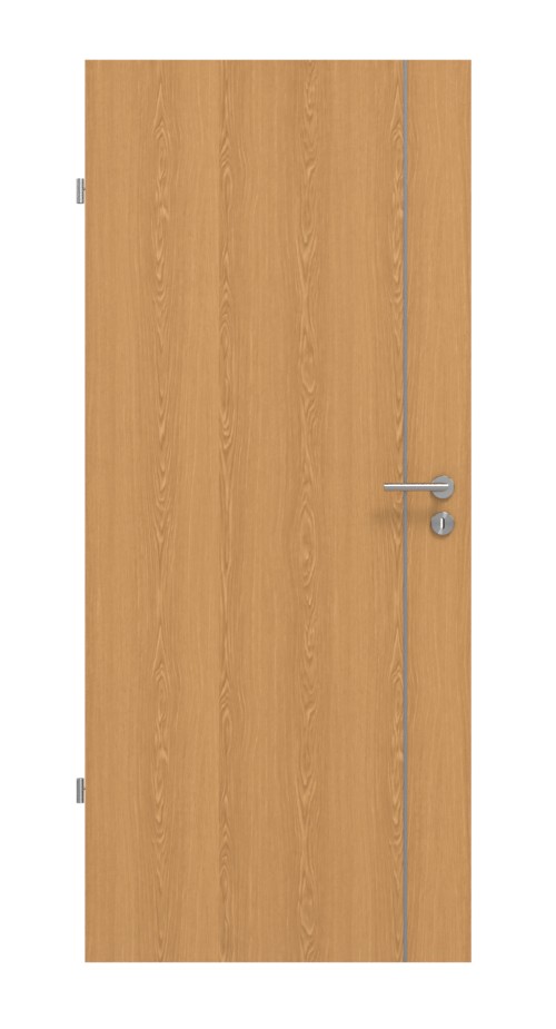 Długa listwa biegnie wzdłuż boku zamka w tych designerskich drzwiach. W wykończeniu Dąb Premium kwieciste słoje łączą się z naturalnym brązowym odcieniem drewna. Dzięki wytrzymałej warstwie wierzchniej CPL nie musisz się martwić o nieestetyczne rysy powstające w wyniku codziennego użytkowania.