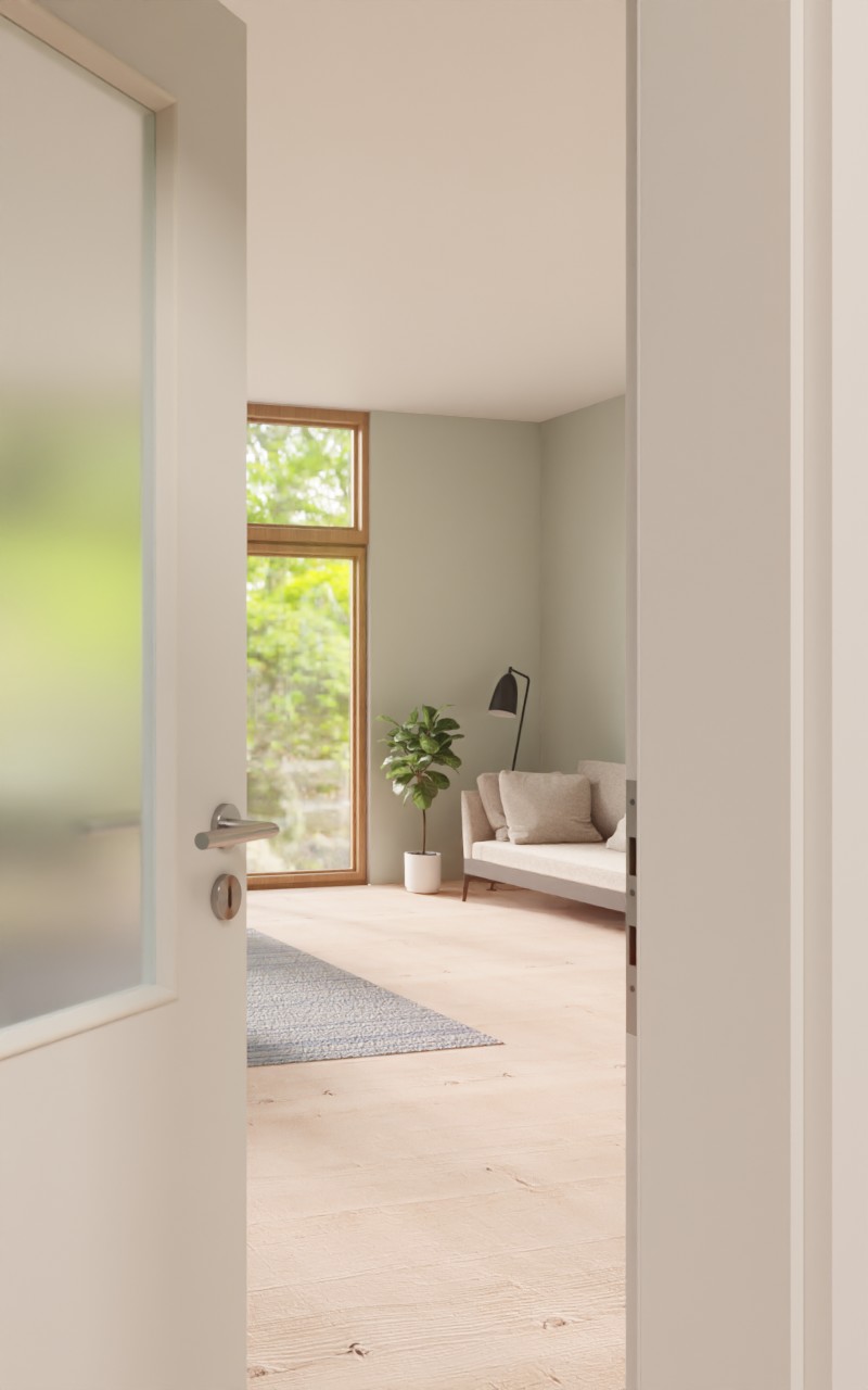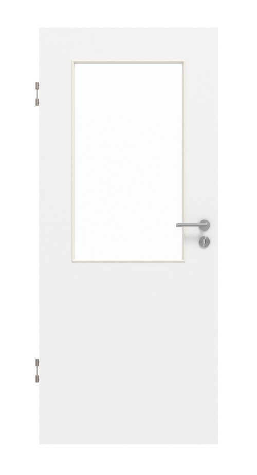 Drzwi wewnętrzne odporne na ścieranie w dekorze HPL D354-60 Designer White z eleganckim przeszkleniem: