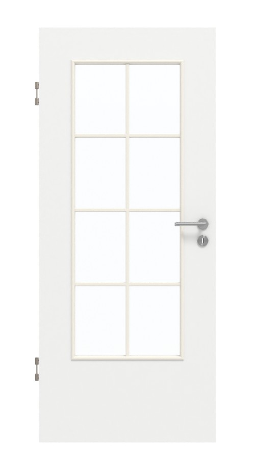 Pomieszczenia, do których zazwyczaj wpada niewiele światła, zyskują dzięki dużemu przeszkleniu. Jest on elegancko podzielony za pomocą ramki z szprosami. Białe drzwi wewnętrzne zachwycają swoim klasycznym wzornictwem. Jasny odcień bieli Designer White pasuje do każdego stylu. Laminat HPL jest łatwy w czyszczeniu i wytrzymuje duże obciążenia.