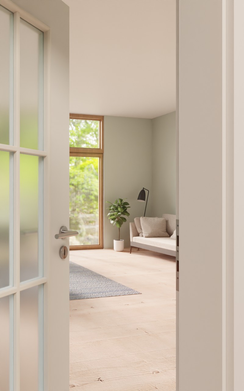 Elegancka, nakładana ramka z szprosami dzieli duży otwór okienny na dziewięć równych pól. Białe drzwi wewnętrzne zachwycają swoim klasycznym wzornictwem. Jasny odcień bieli Designer White pasuje do każdego stylu. Ponadto płyta laminowana HPL jest bardzo wytrzymała i łatwa w pielęgnacji.