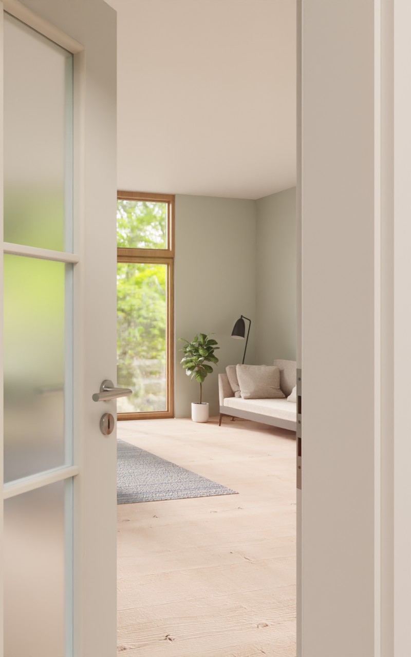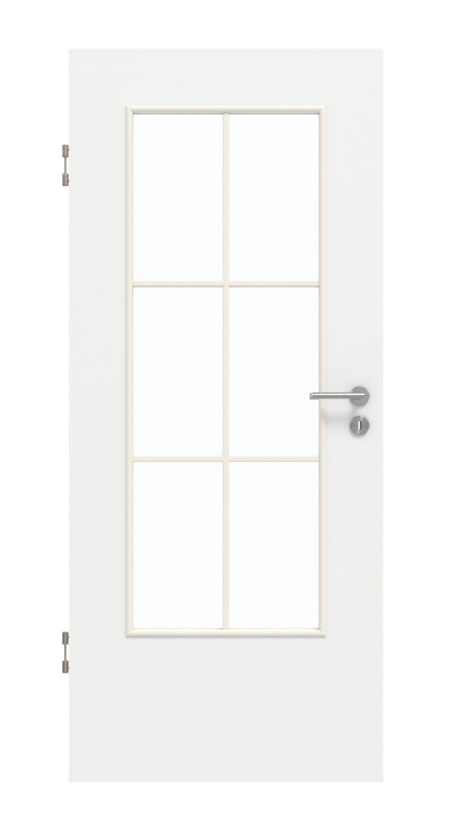 Duży, prostokątny otwór okienny zajmuje większość skrzydła drzwi. Rama z szprosami dzieli szybę wizualnie na sześć pól. Białe drzwi wewnętrzne zachwycają swoim klasycznym wyglądem. Ten jasny odcień Designer White pasuje do każdego stylu wnętrza. Wytrzymała płyta laminowana HPL doskonale radzi sobie z otarciami i zadrapaniami. Ponadto można go bez trudu wyczyścić.