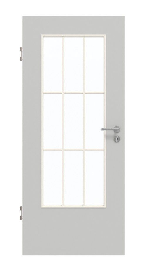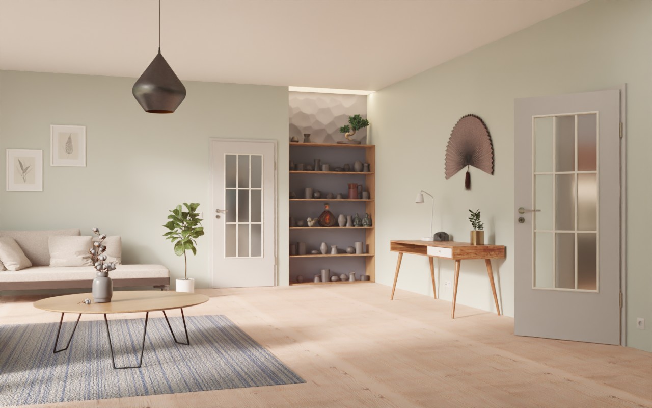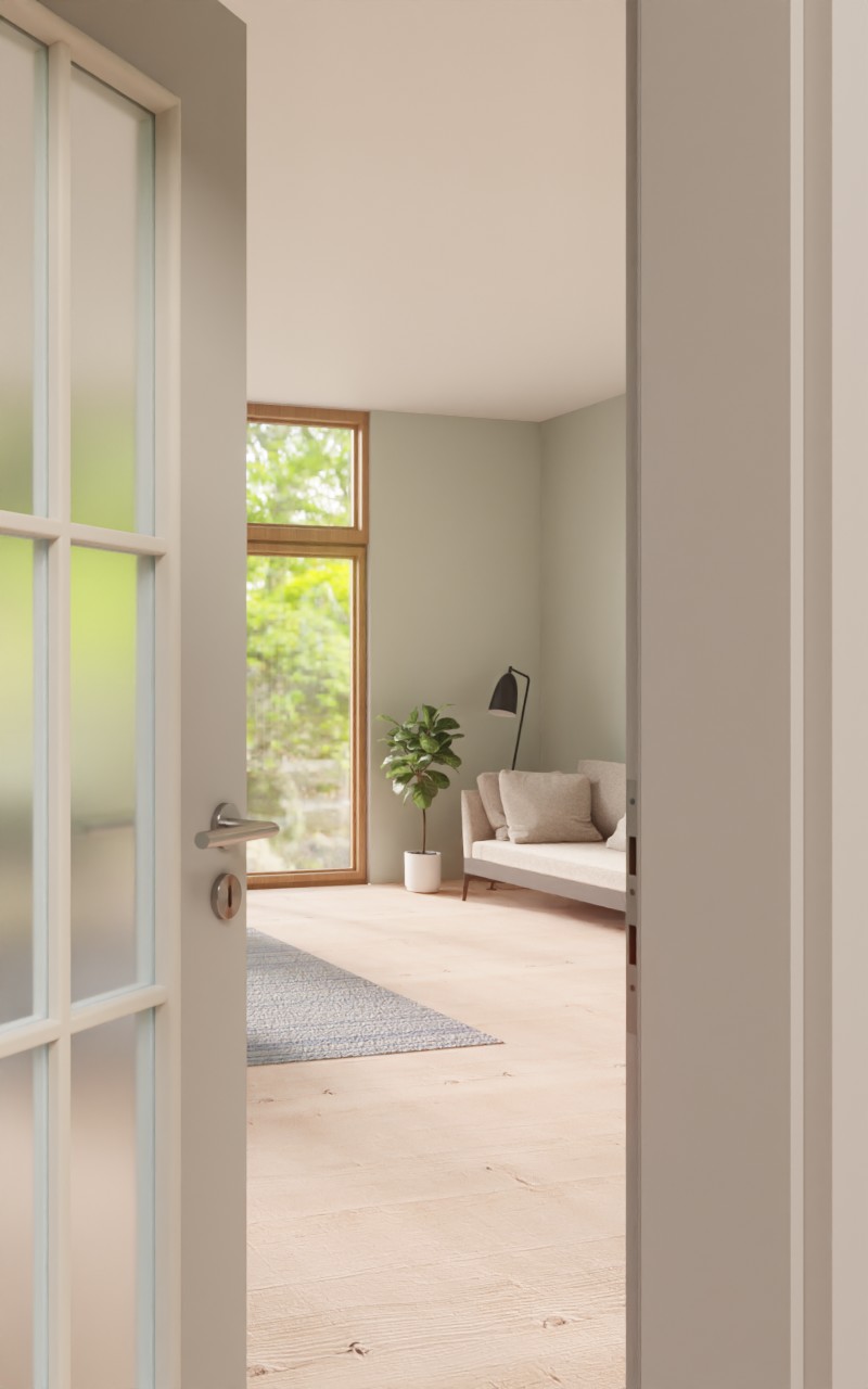 Duży otwór okienny, elegancko podzielony przez nałożone szprosy, zapewnia pomieszczeniu dodatkową jasność. Drzwi wewnętrzne w stonowanym odcieniu szarości emanują spokojem. Kolor Dove Grey stylowo komponuje się z każdym otoczeniem. Łatwa w pielęgnacji warstwa wierzchnia z HPL wyróżnia się również wysoką wytrzymałością.