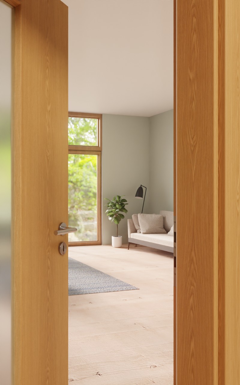 Rama MDF i płyta pełna w rdzeniu to stabilizujące cechy 40 mm grubego skrzydła drzwiowego. Powłoka krawędziowa zapewnia modelowi niezawodną barierę przeciw uderzeniom.